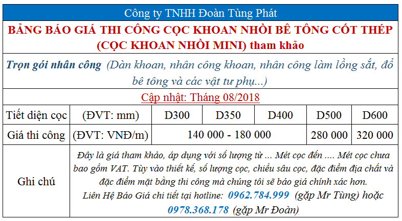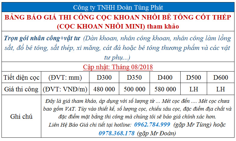 Bảng báo giá thi công cọc khoan nhồi TRỌN GÓI NHÂN CÔNG + VẬT TƯ tháng 8/2018